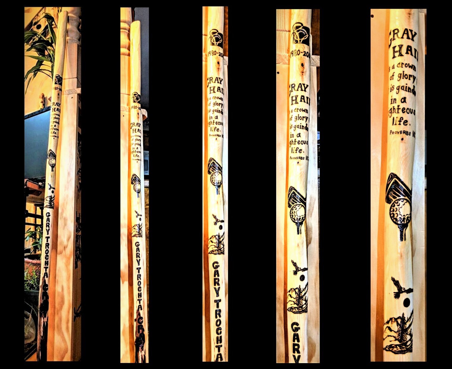 Unique One of a Kind Hiking Sticks, walking sticksCustom created for you, no stamps or machines used,I create each design by hand, so any design or image you wouldlike can be created!Feel Free to Message me with design Ideas and words you would like ArtisticCreationsbyRose [!at] comcast.netFrom My