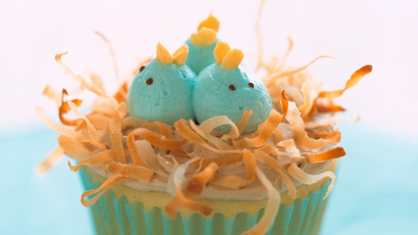 A trio of newborn birds snuggles in a cozy nest of toasted, shredded coconut on top of these picture-perfect cupcakes.