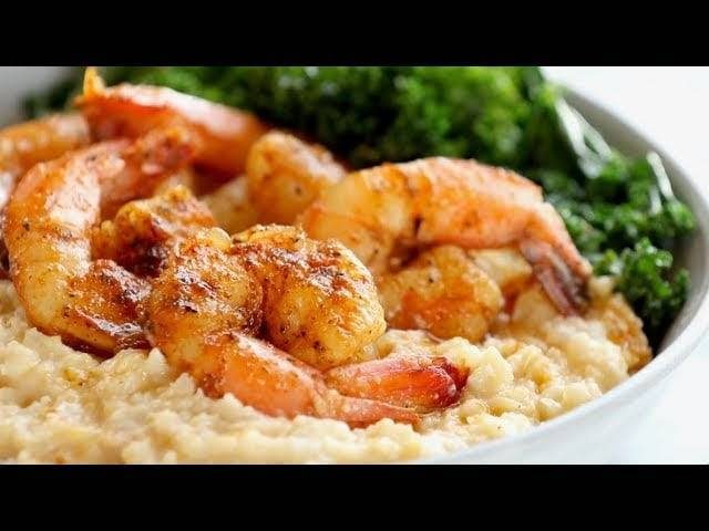 Spicy Shrimp with Cauliflower Mash and Garlic Kale - tender-sweet shrimp and smoky garlic kale over creamy cauliflower mash. DELICIOUS weeknight dinner!
