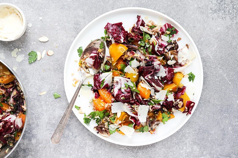 A filling vegetarian and gluten free Winter salad with radicchio, beets, wild rice, tangerines, parsley and almonds.