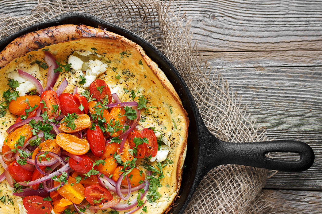 This savory Tomato and Goat Cheese Dutch Baby recipe features tomato, onion and goat cheese for a delicious and easy brunch or weeknight dinner meal.