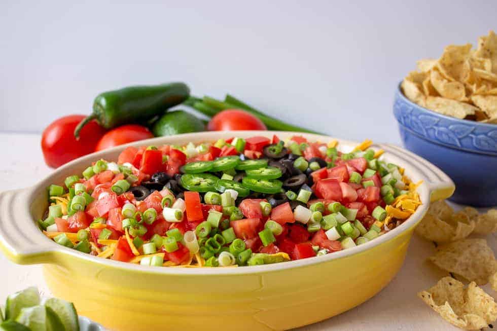 Mexican Layered Dip is made with refried beans, sour cream, salsa, guacamole and all your favorite toppings. This appetizer dip is perfect for parties and football watching.