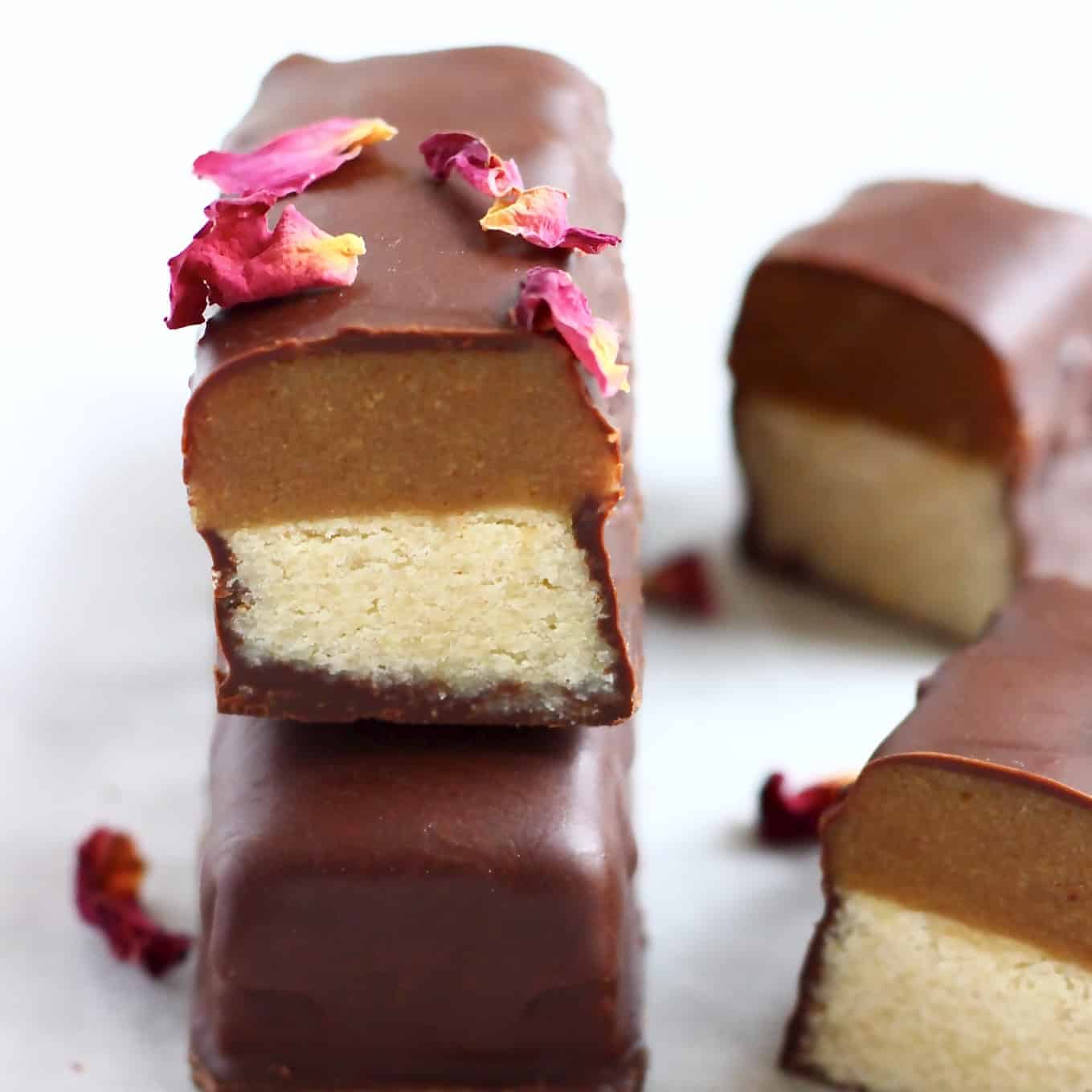 These Vegan Twix Bars are just as delicious as the real thing: a crunchy shortbread base topped with fudgy caramel coated in silky chocolate! Gluten-free.