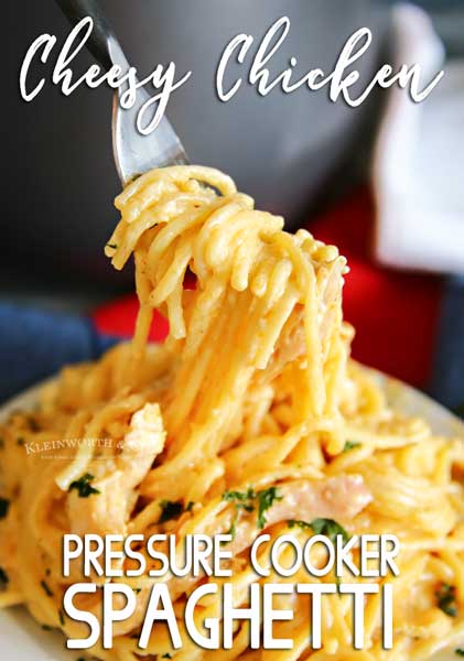 The Cheesy Chicken Spaghetti is an easy pressure cooker dinner using the leftover rotisserie chicken. Quick to make & so delicious too.