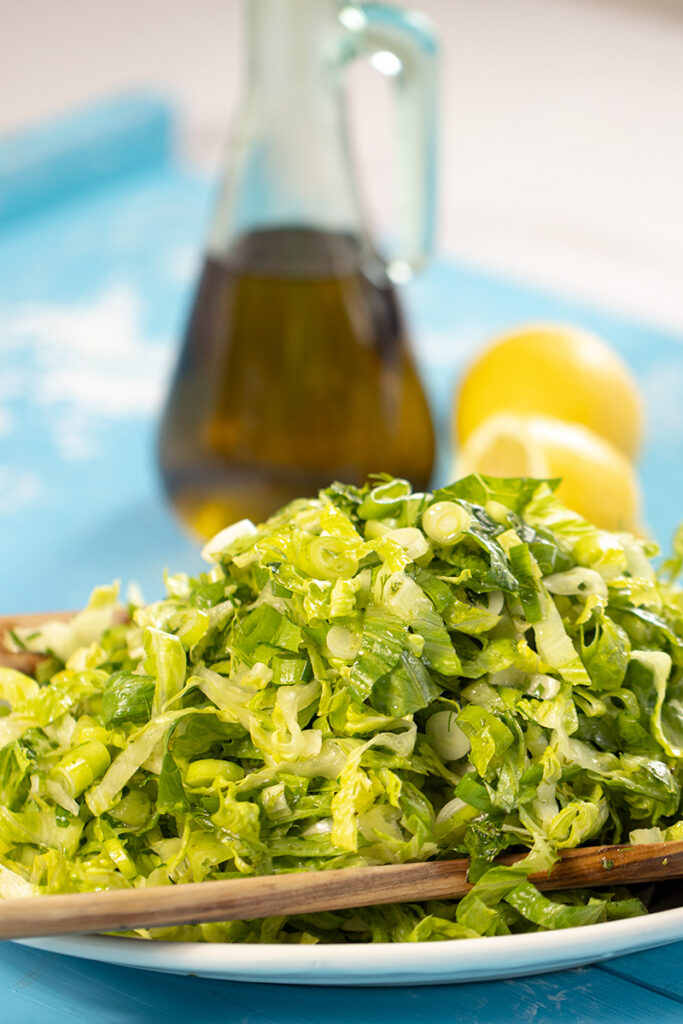 Maroulosalata basically translates to Lettuce Salad in Greek. It is a classic recipe that is made with thinly sliced lettuce, Scallions, fresh herbs like dill, parsley, and mint, and tossed in a bright vinaigrette. Simple yet so delicious and is the perfect complement to any main dish.