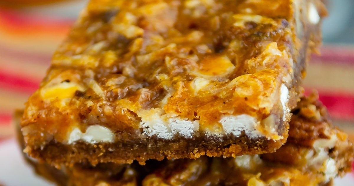 Your favorite Magic 7-layer bar with PUMPKIN! These bars have a gingersnap crust, white chocolate, pecans, toffee, and coconut!